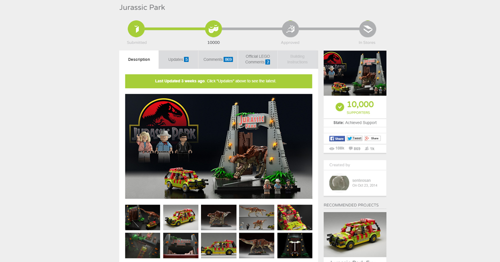 Here’s a real quick rundown of Lego CUUSOO. On Lego’s idea site, fans submit proposals for new Lego sets that don’t currently exist on the market, like Jurassic Park for instance. Then, each proposal requires 10,000 votes. If a set hits that number, then the set goes through the “Lego Review Phase” and a review board goes through the proposals and chooses which one will become the next Lego’s Idea Product that will be sold online and shipped to stores. In addition, members whose products are chosen get a share of the profits. Pretty neat huh?